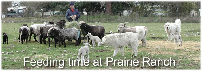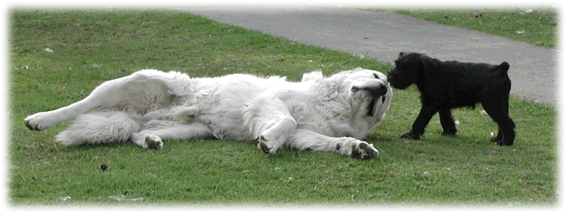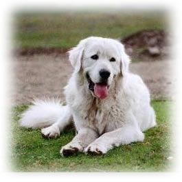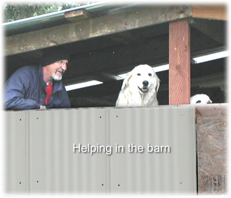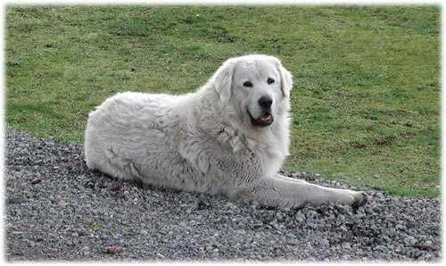 This is the OWCZAREK PODHALANSKI breed. It originates in Poland and is commonly referred to as the Polish Tatra Mountain Dog. In early 2002 we imported 2 unrelated puppies from Poland. They both took on their own personalities and have become very helpful with the sheep and guard duties. In 2003 we brought in another female, Ninni, from Finland to join the clan. In early 2004 we lost our oldest female so we are back to 2 dogs at this time.
